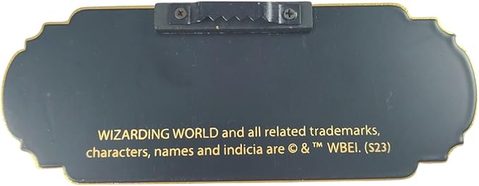 Cette plaque métallique noire présente un motif étoilé « phosphorescent », avec le titre «Lumos» en doré, l'inscription« To Illuminate a Wand » (Pour illuminer une baguette) en blanc (également phosphorescente) et une finition métallisée. Elle est complétée par une bordure en bois doré et un crochet pour l'accrocher au mur.