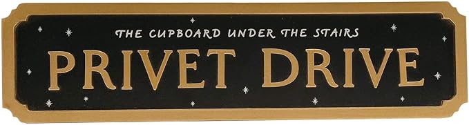Cette plaque murale en métal noir présente un motif étoilé « phosphorescent », avec le titre « Privet Drive » en 3D doré, l'inscription « The Cupboard Under the Stairs » (le placard sous l'escalier) en blanc, également phosphorescente, et une finition métallisée. Elle est complétée par une bordure en bois doré et un crochet pour l'accrocher au mur.